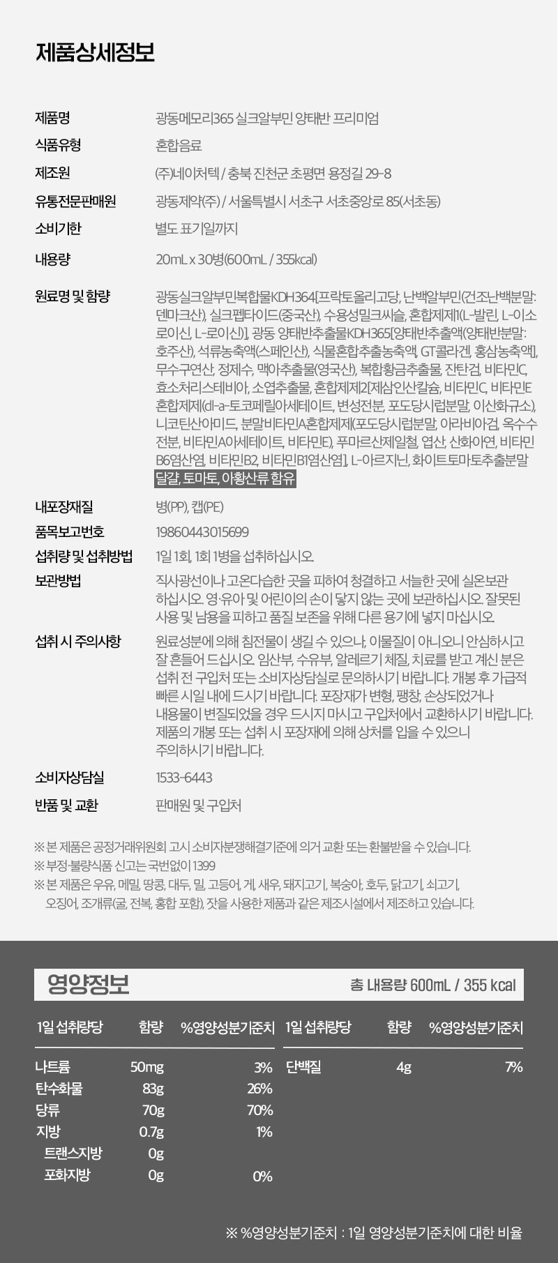 제품명 : 광동 메모리365 실크알부민 양태반|판매대리점 : 제이피솔루션