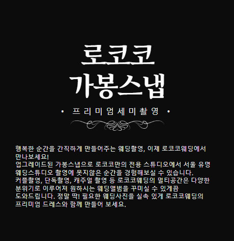 © 2024 로코코웨딩 • 사업자등록번호 892-86-00363 • 대표 최종일 • 인천시 남동구 구월남로 117 가주프라자 6층 • TEL +82 32.713.7988 Copyright ⓒ 로코코웨딩 All Rights Reserved.